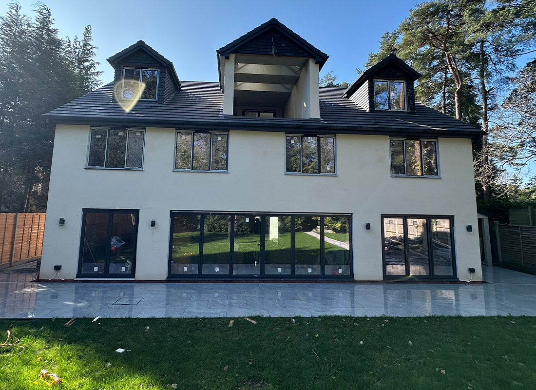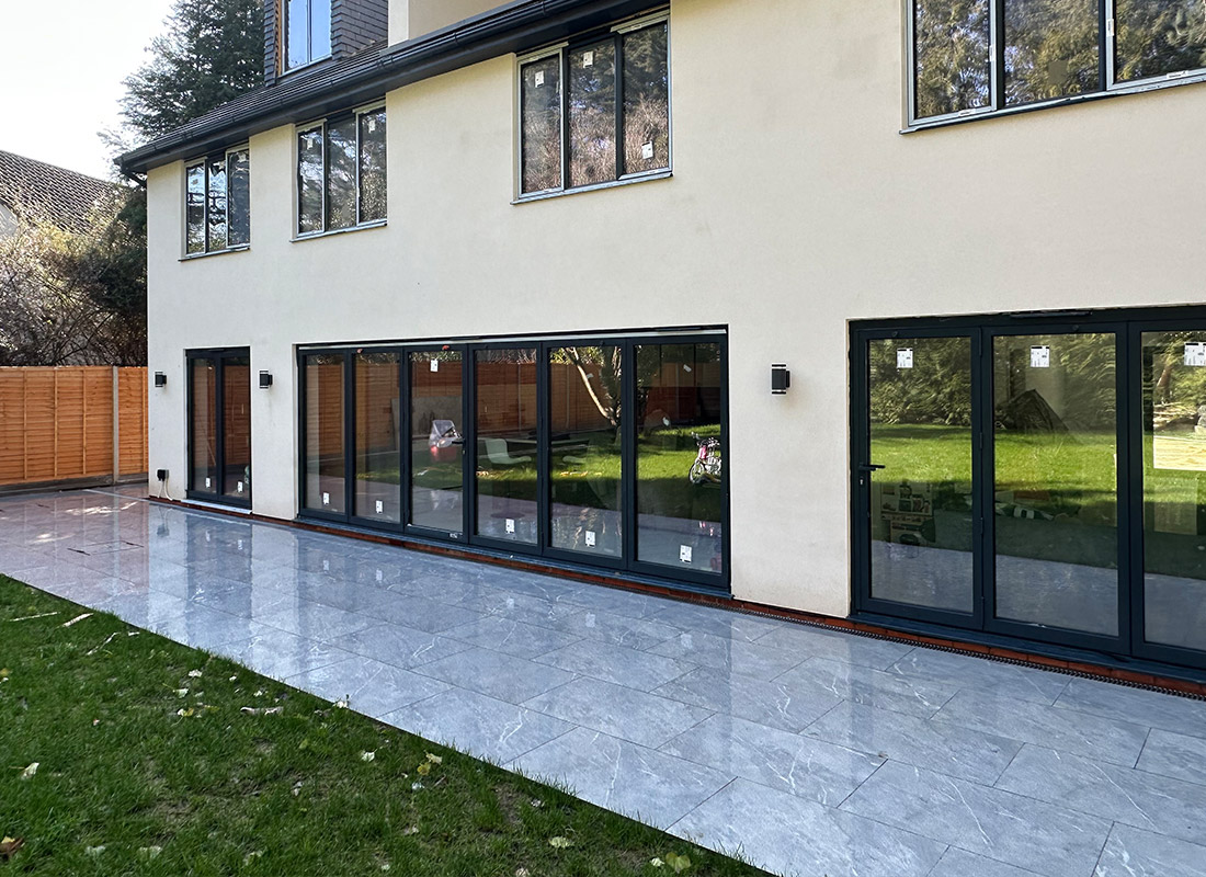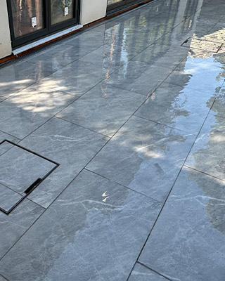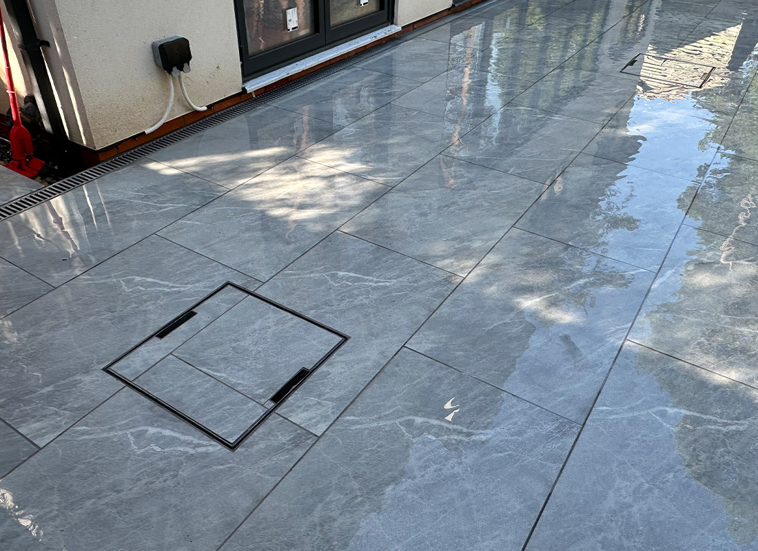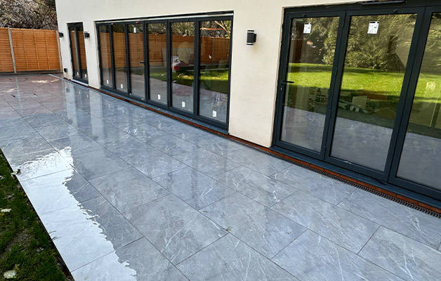 To complement the modern property, porcelain paving was chosen for the patio and sides. Porcelain paving is a very popular option for contemporary outdoor spaces, as it is elegant, hard-wearing and long-lasting.