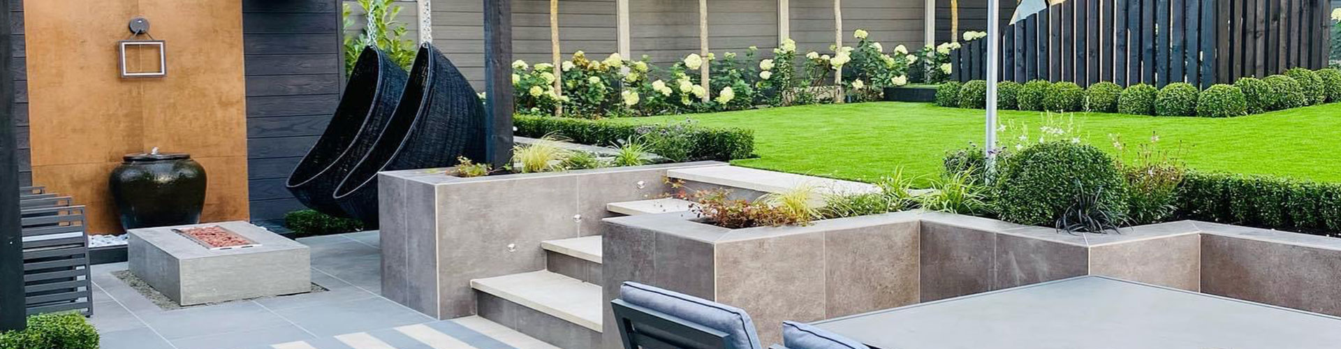 Porcelain paving was used for the main patio area and cladding for the retaining walls. We incorporated a bench into the wall to maximise the entertaining area. The entertaining area also included a fire pit, water feature chosen by the customer, two swinging chairs and an outdoor kitchen which housed a Kamado BBQ.