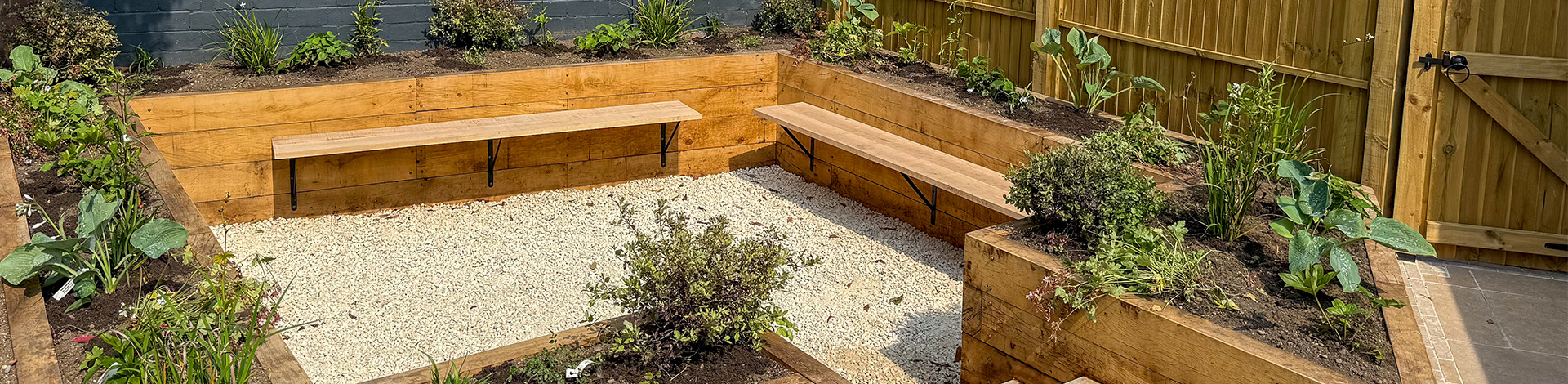 As a complement to this new patio, our team also designed and installed a bespoke seating area. These sunken seats were installed using solid oak sleepers to align with the traditional appearance of the property and new paved areas, as well as provide years of use.